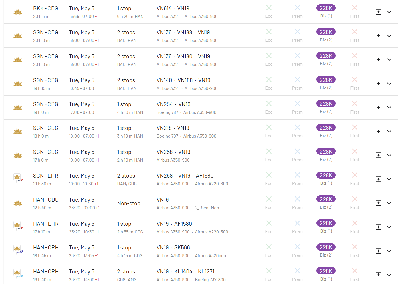 Snyggt. Ser också ut att finnas Singapore-Hanoi den 5/5 med ankomst till Hanoi15:35. Är det en OK rutt, dvs SIN-HAN-CDG-CPH?