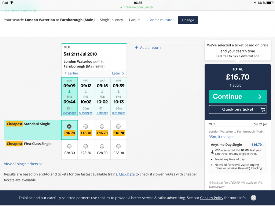 Kollade och såg att åka in till Waterloo och sedan Farnborough skulle ta 2.5-3 timmar och bil går troligen på runt 40 minuter