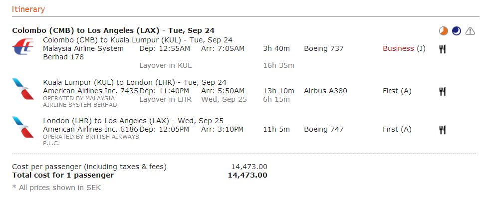[First class] Colombo-Los Angeles enkel, American Airlines, 18.700 SEK exkl. skatter