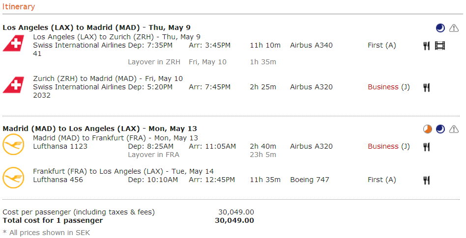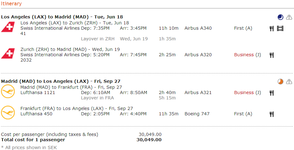 [First Class] Los Angeles - Madrid (Lufthansa, Swiss) fr. 29.900 SEK