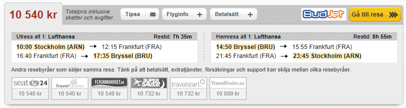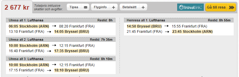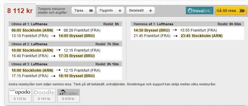 Totalpris tre personer tur och retur 6230 SEK. Inga evigheter på Frankfurt men å andra sidan tåg/buss/hyrbil från Eindhoven (cirka en timmes resa med bil till Bryssel).