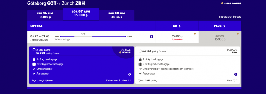 Bifogade bilder i inlägg #5119Nej, att "boka vanlig biljett men väljer att betala med poäng" kostar inte automatiskt 15 000p, det är dynamisk prissättning. Det är endast SAS BONUS (lägsta pris) som kostar 15 000p (enkel väg). Eller missförstår vi dig?