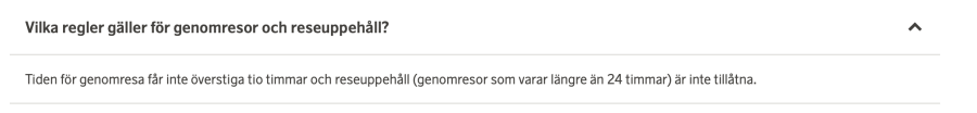 och reseuppehåll (genomresor som varar längre än 24 timmar) är inte tillåtna.
