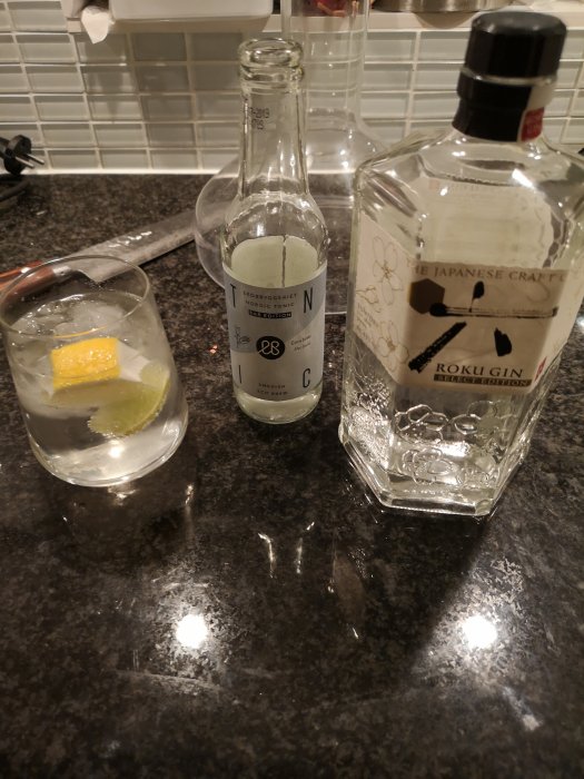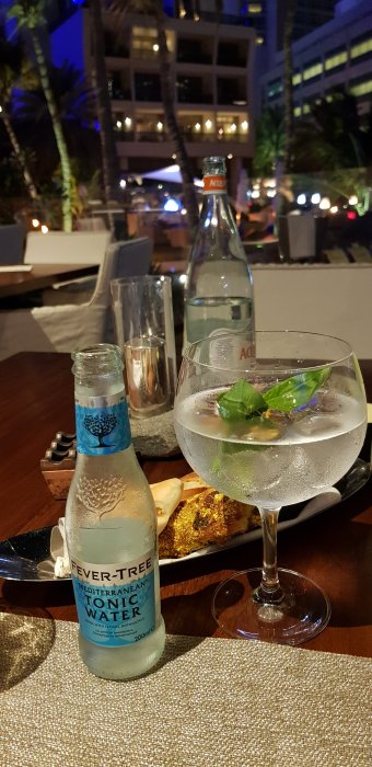 Jag älskar G&T och det är den enda drinken jag dricker, men har inte provat så många olika varianter och hållit mig framförallt till Bombay gin och vanlig tonic med ekologisk citron (kanske inbillning med ekologisk men upplever den bra mycket godare) men tänkte att jag skulle gå utanför min comfort zone och prova någonting nytt. På rekommendation av servitören blev det en Gin Mare med basilika och Mediterranean Tonic. Mycket intetsägande smak där basilikan tog över allt för mycket och tonicen mest kändes som kolsyrat vatten.