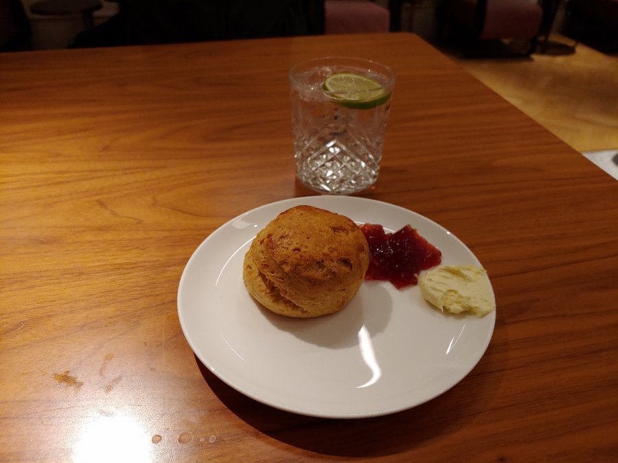 När är du framme, vi landar typ 2230Nästa flygplats och den här gången "British afternoon tonic" och inget te.Fever-Tree, Beefeater och en scone med tillbehör i Qantas London Lounge, LHR T3.