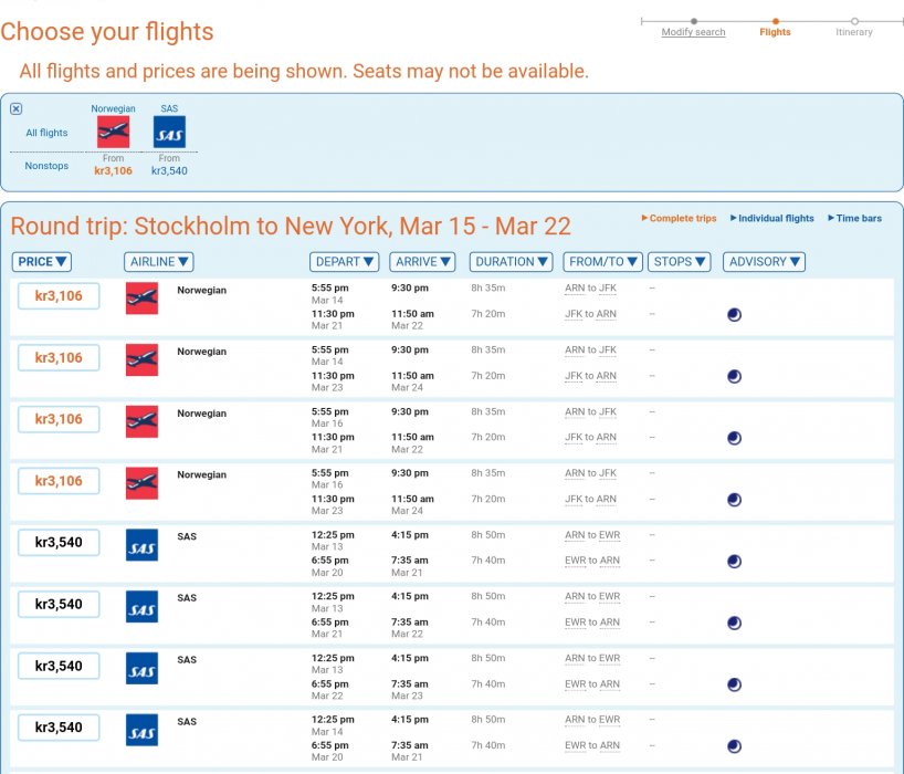 OK, jag gick in på SAS hemsida nu precis för att se om ditt pris stämmer på 4895 kronor men det gör det inte. Priset som jag fick fram via Matrix gäller fortfarande även när man går in på SAS hemsida. Om du tittar noga på screenshoten ser du att jag sökt på 15-22mars +-2 dagar för att få fram billiga priser under en vecka. Vid tiden för sökning så var det de priserna som var aktuella men vi vet ju alla att sådant kan ändras. Men priset på SAS flighter som står i screenshoten gäller fortfarande om jag går in på SAS hemsida.