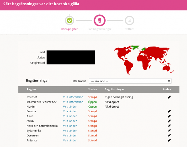 Det som var nytt för mig är att specificera vilka världsdelar man vill att kunna använda kortet.