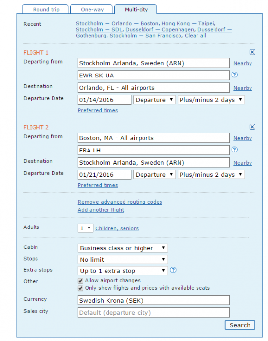 Resan jag tänker göra är Stockholm -> New York (SAS) och New York -> Orlando (United), hemresan Boston -> Frankfurt (Lufthansa) Frankfurt -> Stockholm (Lufthansa).