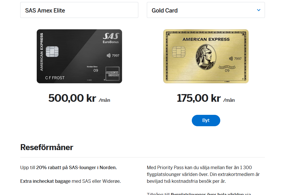 Invite kampanjen nu på Amex Elite gör att kortet är en no brainer i dagsläget då poängen du får är värda långt mer än årsavgiften.Funderar på kreditkort. SAS Amex Elite, SAS Amex Premium eller SAS Eurobonus Mastercard. Amex Elite verkar bra men dyrt, SAS Eurobonus Mastercard hälften så dyrt (men ger kanske halva mängden nivåpoäng för mig) och Mastercard är väl mycket lättare att använda överallt, eller? Hur bra funkar Fly Premium, resp. 2-for-1 i praktiken, någon som vet? Någon som haft båda som har jämfört?
