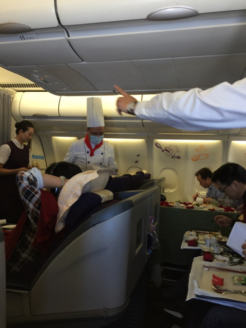 Jag vaknar av att det snackas mycket i kabinen, ( det gick igenom mina bose lurar), nåja tänkte jag, det är ju kina så biz as usual men tittar upp lite och ser att man står och fotograferar en massa och en onboard chef har dykt upp med en vagn.