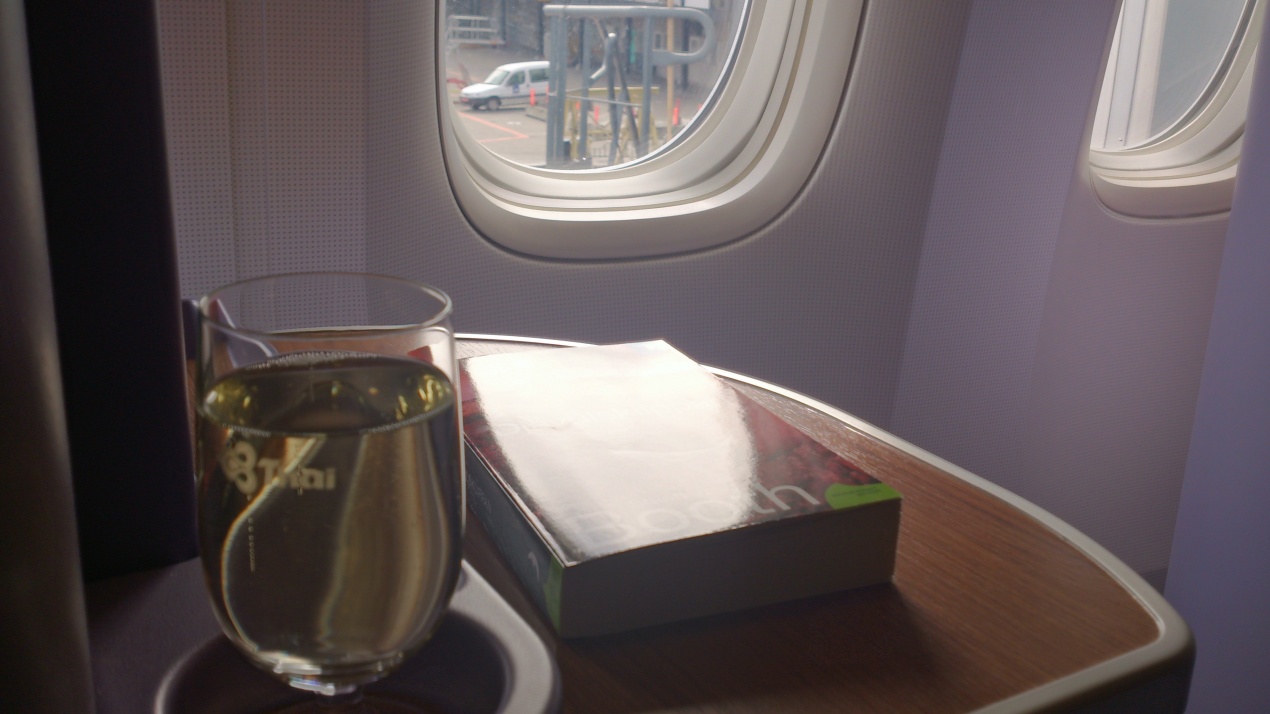 Boardade sent, när C och U redan hade haft sin priority boarding. Blev ändå ledd till min plats och fick frågan om champagne eller apelsinjuice. Redan där så fick min vurm för monopolet en törn, de har ju slutat med det även i business då planet står på backen. Som talesättet säger så skall man ju inte dricka innan lunch, och som tur var så var det efter lunch CPH-tid, så jag tackade ja till champagnen. Det var en standard Piper-Heidsieck som är helt ok som vardagschampagne. Nöjd med det så börjar jag kolla in kabinen. Det var en i princip splitterny 777 som skulle ta mig till BKK. Då är det inte förvånande att allting var rent och fräscht, stolarna var sköna, knapparna för stolsinställningar var inte nötta, och det är alltid trevligt att kunna se ut utan en massa repor på fönstret. Som vanligt så var det inga köer på CPH och push-out skedde i tid. Jag satt på rad 20, precis vid motorn, och blev förvånad över det kraftiga ljudet då de varvade upp motorn, vet inte om det var för var jag satt eller att dessa motorer är extra ljudliga (GE). Hårdvaran var exakt detsamma som säljs som business, dvs full flat stol, där jag med nöd och näppe fick plats när jag låg på rygg (191 cm) fast när jag kröp ihop i fosterställning var det riktigt bekvämt.