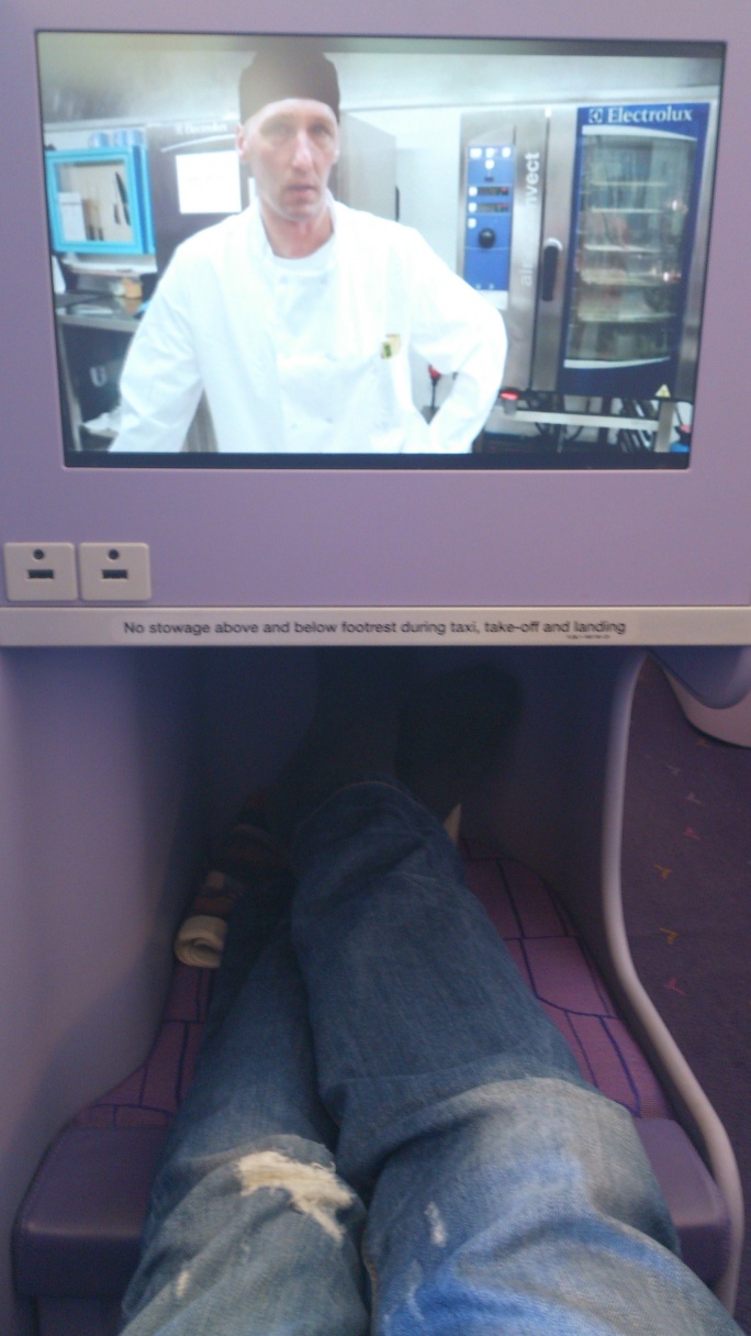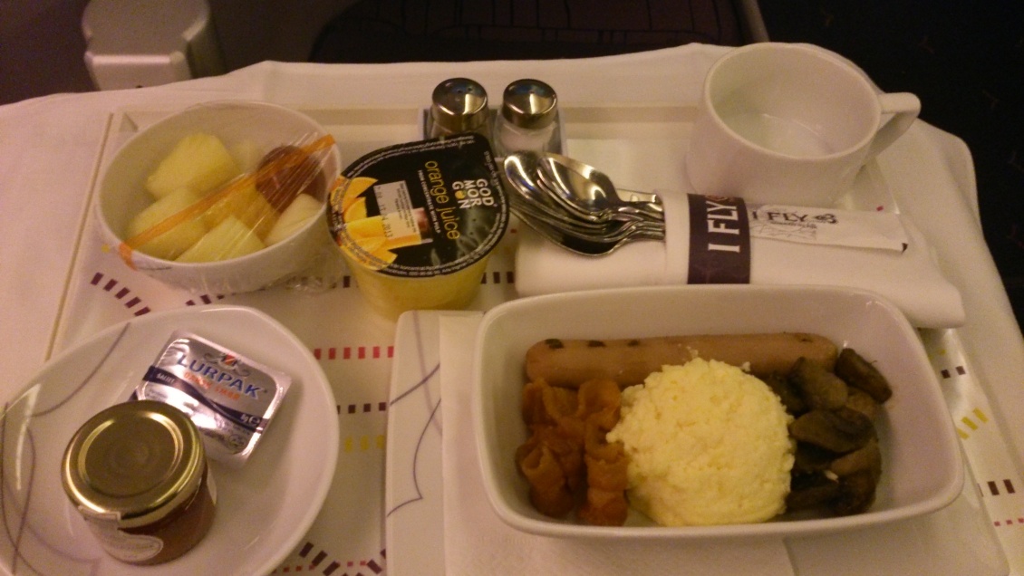 Jag pillade lite på sätet för att hitta en skön sittställning, de har inte bara ”sitt” och ”ligg”, utan även ”relax” vilket är en skön blandning. Och jag var överlycklig att sitta i ett säte där kontrollerna fungerar (läs till skillnad mot SAS). Matserveringen då? Som nämnts så skulle jag ha specialkost. Vanligtvis så brukar specialkost vara bra, även i economy och inget undantag här. Det var faktiskt bland det bästa jag har ätit på ett flygplan. Att få till ett gott mos är ju inte så svårt, men att få till en sådan saftig kyckling som har blivit uppvärmd igen är svårt. Till skillnad mot hur det är ibland på SAS så var folien borttagen vid servering, samt så var salt- och pepparkaren av riktigt glas. Maten var som sagt bland det bästa jag har ätit (endast slagit av en riktigt blodig biff för några år sedan under den där resan i C med Thai BKK – SIN). Enda riktiga besvikelsen var det ljumna beska kaffet som serverades.