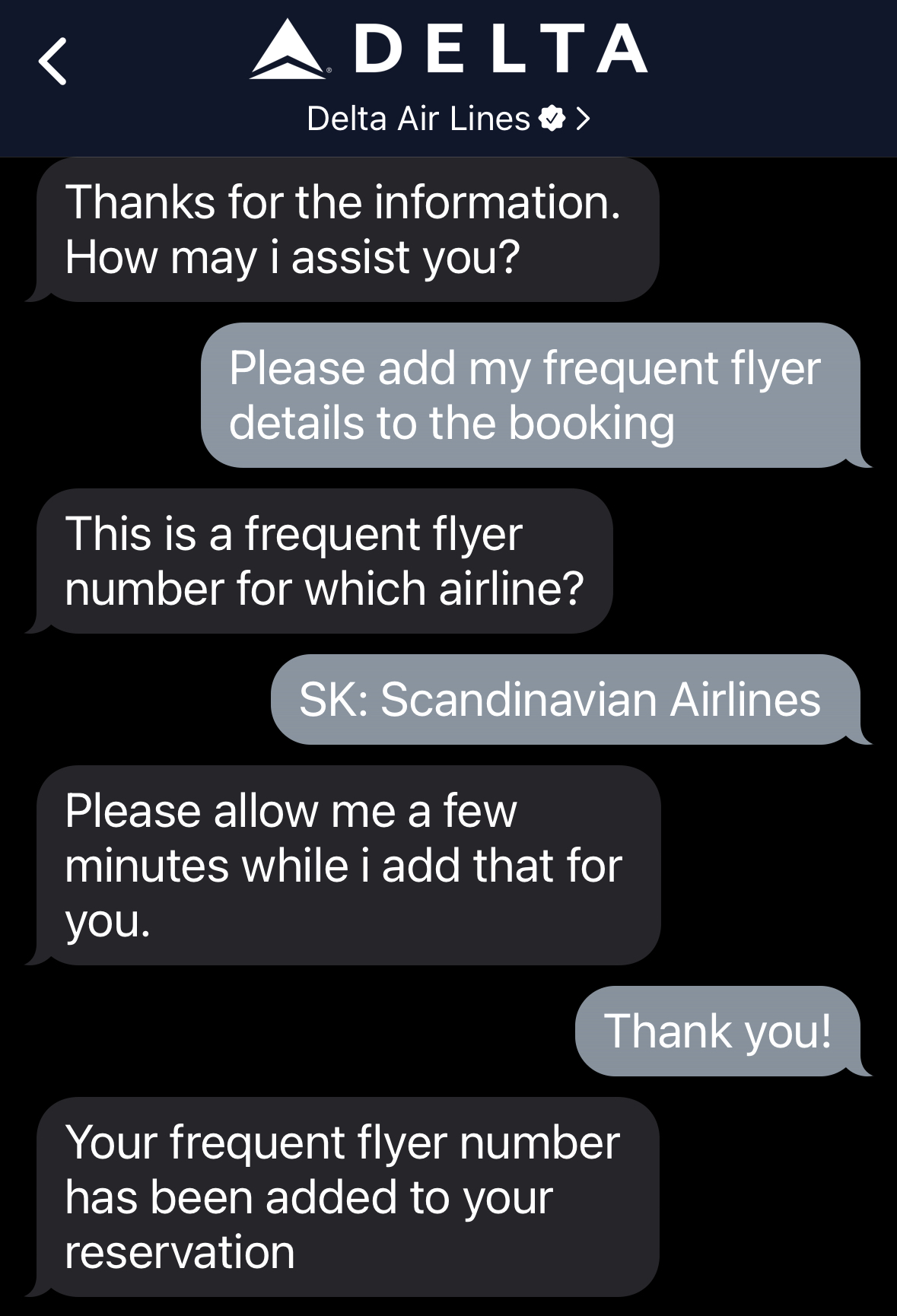 Har Deltas PNR och kan logga in och se min bokning. Har chattat med dem via webben, men då gick det inte att lösa. Ska testa detta.