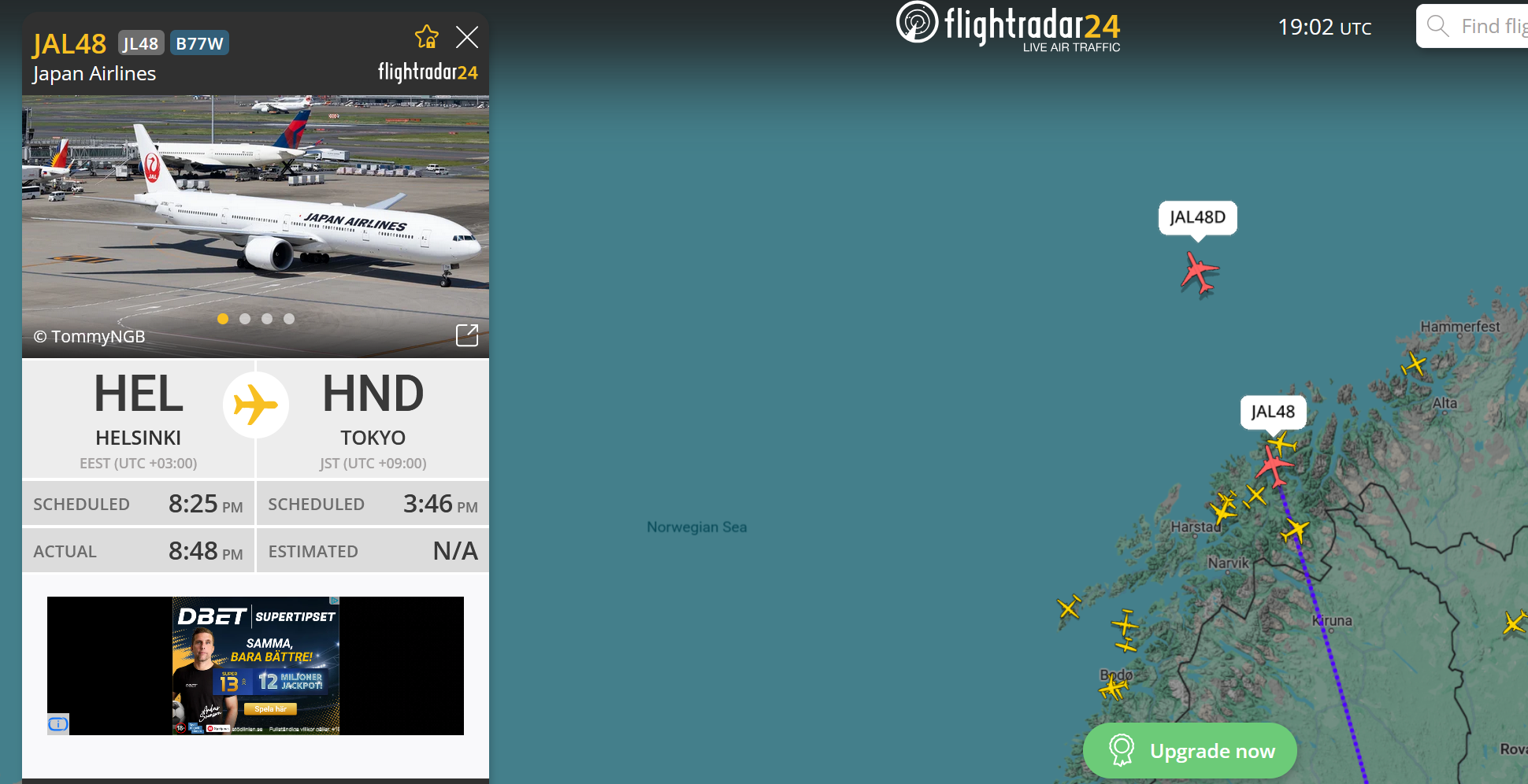 Ursäkta men förstår inte vad du menar? JAL flyger HEL-HND och FIN flyger HEL-HND/NRT?Japan Airlines kör med två st 777-300 från HEL till HND nu. Antar F-kabin finns på båda. Samtidigt tycks bara Finnair "våga" flyga rakt över nordpolen till HND och NRT.