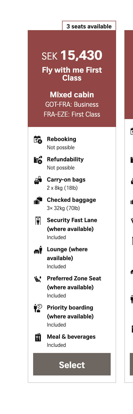 Jag väljer destination, inom rätt datum, och för två personer. Får upp att first kostar 43k danska, när jag sen klickar mig vidare så står det 86k istället?