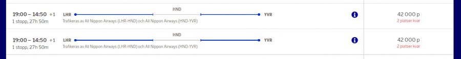 Du kommer "aldrig" hitta business till HNL för UA (eller AC) släpper (i princip) inte C till HNL, och SAS *A sida visar inte blandade klasser. Det bästa du kan göra med denna sida är att boka nåt du gillar till LAX/SFO/YVR och sen ringa in för att lägga på ett flyg i eko.Det är fortfarande ganska buggigt. Jag fortsatte leta ARN-HNL och det är en hel del platser att välja på i ekonomi. Senast fick jag upp dessa till ett poängpris av 35000 poäng per sträcka i ekonomi. Jag provbokade två platser till en slutsumma av 140000 poäng. Jag kom ända fram till betalning med detta pris och skatter på 2900kr. Det gick dock inte att applicera någon voucher på poängen. Eftersom jag inte hittade några platser i business gav jag upp.