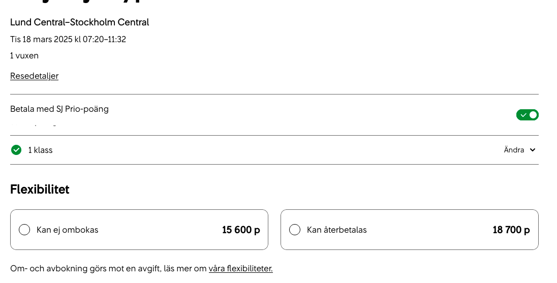 Här tar vi ett slump-exempel till, nu en tisdag 3 månader bort. Mellan 15600 och 18700 poäng enkel resa.