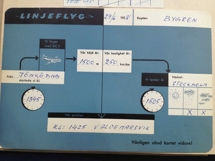 En raritet. Flög också DC3 1958 eller 59 från Bromma till Karlstad och Metropolitan sträckorna Karlstad-Bromma-Kalmar. Kommer ihåg att man delade ut polkakarameller och jag som 5 åring fick ta tvåVar ett år gammal och flög från Jönköping till Bromma. Enligt det informationskort som delades ut under flygningen (se bild) flög kapten Bygren i hela 250 km/h med DC3:an...