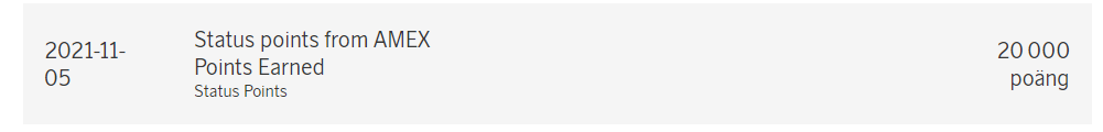 Det borde stå så ungefär en gång per år.Upptäckte just detta - att jag kanske gått miste om statuspoäng under en tid. Det här är senaste inlägget jag kan hitta där jag fått in 20 000 statuspoäng från Amex. Kan jag ha missat något, eller sipprar poängen in på ett annat sätt numera (eller borde det stå så här ungefär en gång per år)?