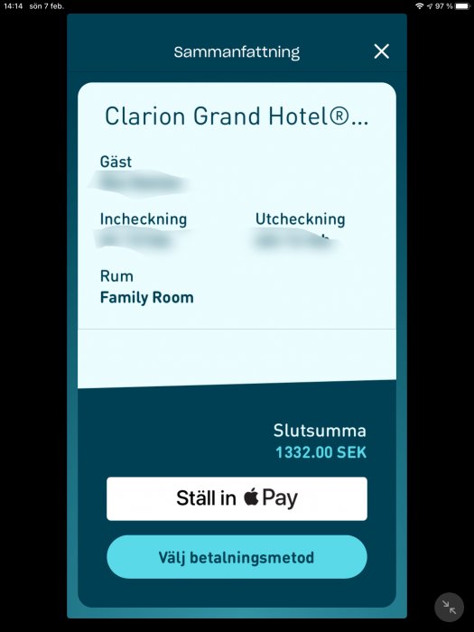 Nu måste jag avslöja min brist på rutin. När jag tittar i appen kan jag se mina bokningar (i mars och maj samt ”betala” syns på samtliga) men inte vilken typ av rum jag bokat (och således kan jag inte se ev uppgraderingar heller)?Jag kom fram till Valborg. Efter det dyker inte knappen "Betala" upp, så då kan man inte se.