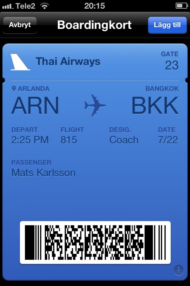 I mejlet klickade jag på "Boardingkort" och en ny bild med boardingpasset öppnade sig, klickade på lägg till uppe till höger men inget såg ut att hända. Men när jag öppnade Passbook så låg mitt nyskapade boardingkort där och väntade.