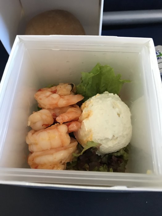 Räkor, sallad, nån slags ”bulgur look a like” och sen nån god ostkräm. Tillverkad av cateringen i Athen. Fler såna tack.