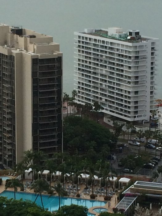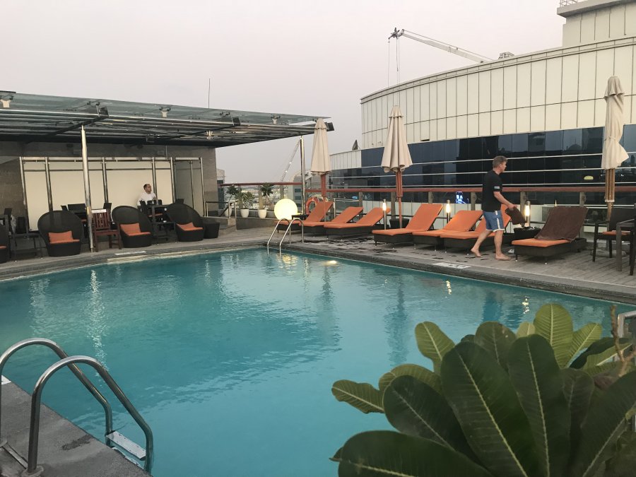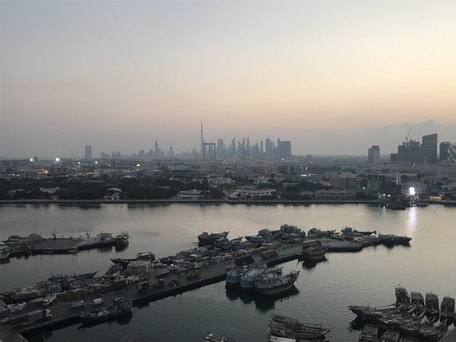 Hilton Dubai Creek. Blev uppgraderad till ett rum som stank rök, nej tack, så det blev det bokade rummet istället. Fin utsikt från taket. Dock inga kompispriser på fikat.