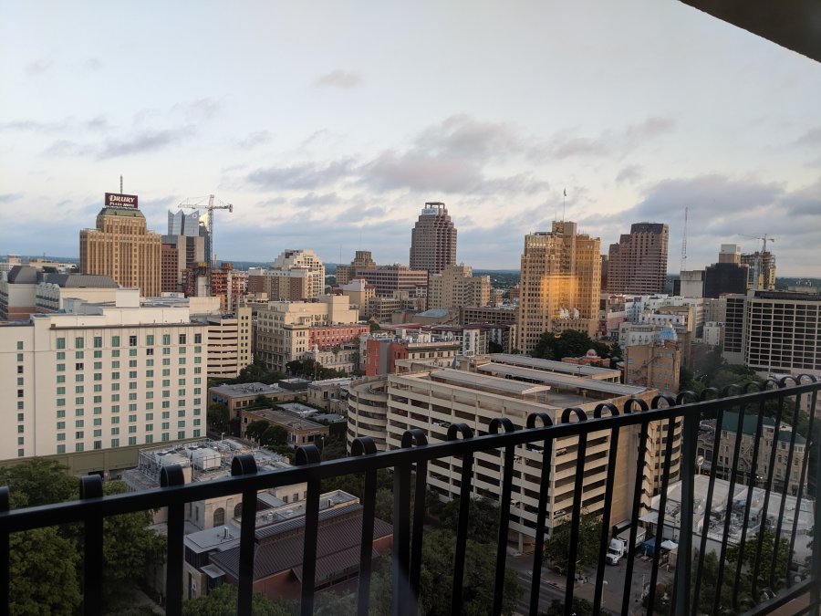 Utsikt från våning 21, på Hilton Palacio del Rio i San Antonio. Rejält tilltagen balkong, som det tyvärr var alldeles för varmt att vistas på mer en nån minut, i ett 40 C Texas.