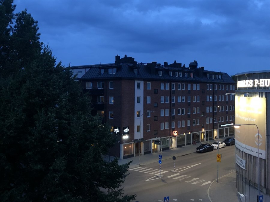 Rådhustornet till vänster. Matteuskyrkan rakt fram (i fjärran). Migrationsverket och Kriminalvården huserar i byggnaden till höger (med den inspirerande arkitekturen).
