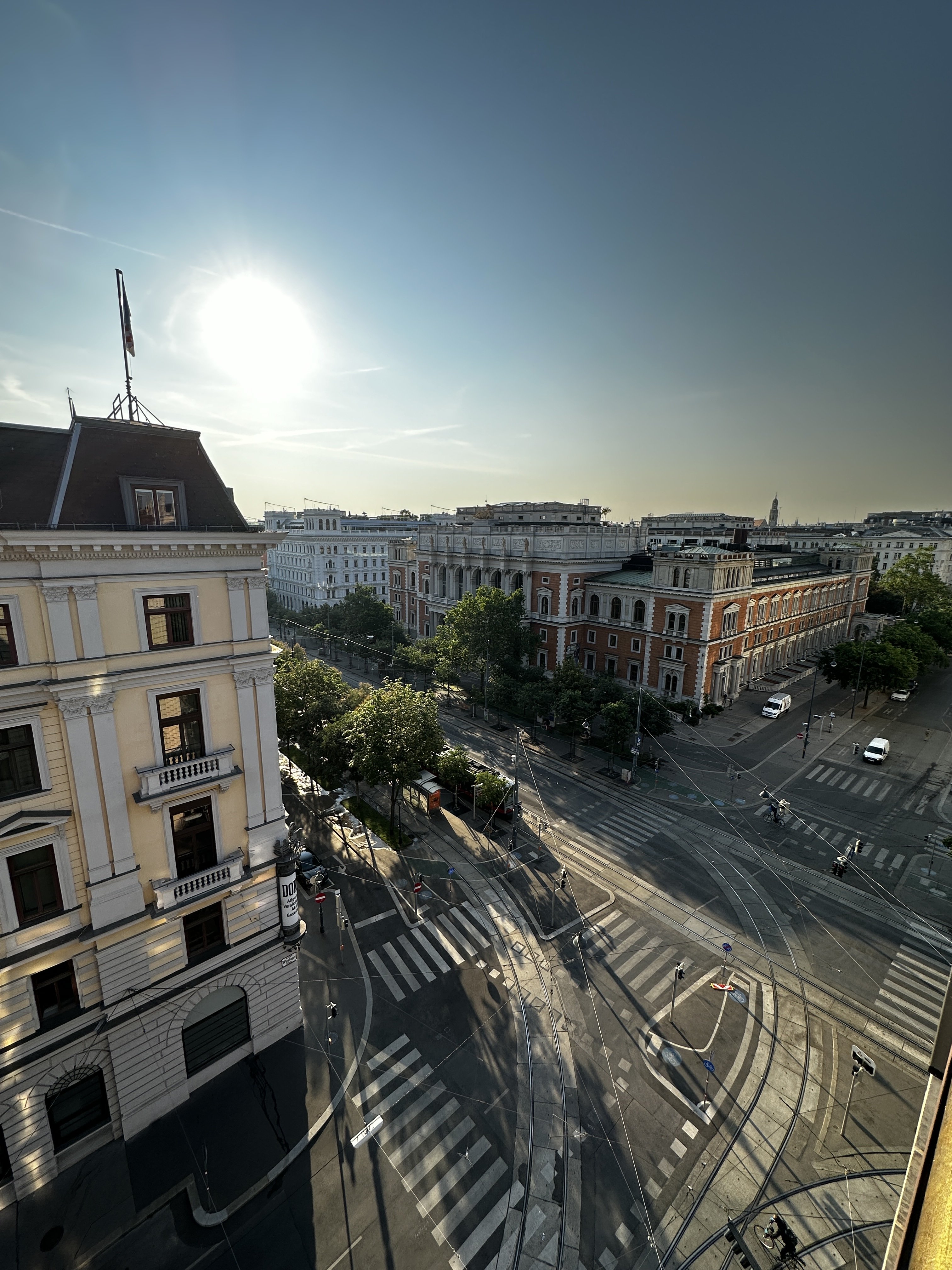 Hilton Vienna Plaza. Fin utsikt från hörnrummet på 9:e våningen. Fransk balle och mycket ljusinsläpp i rummet. Dock väldigt varmt. Trevligt hotell.