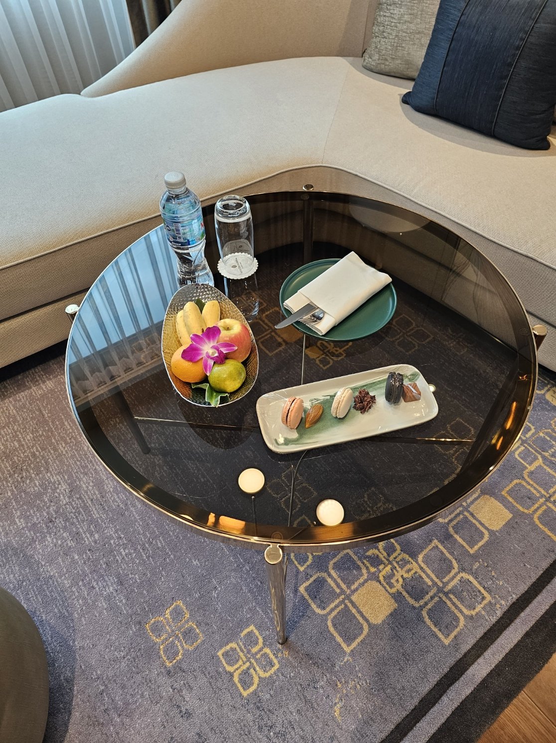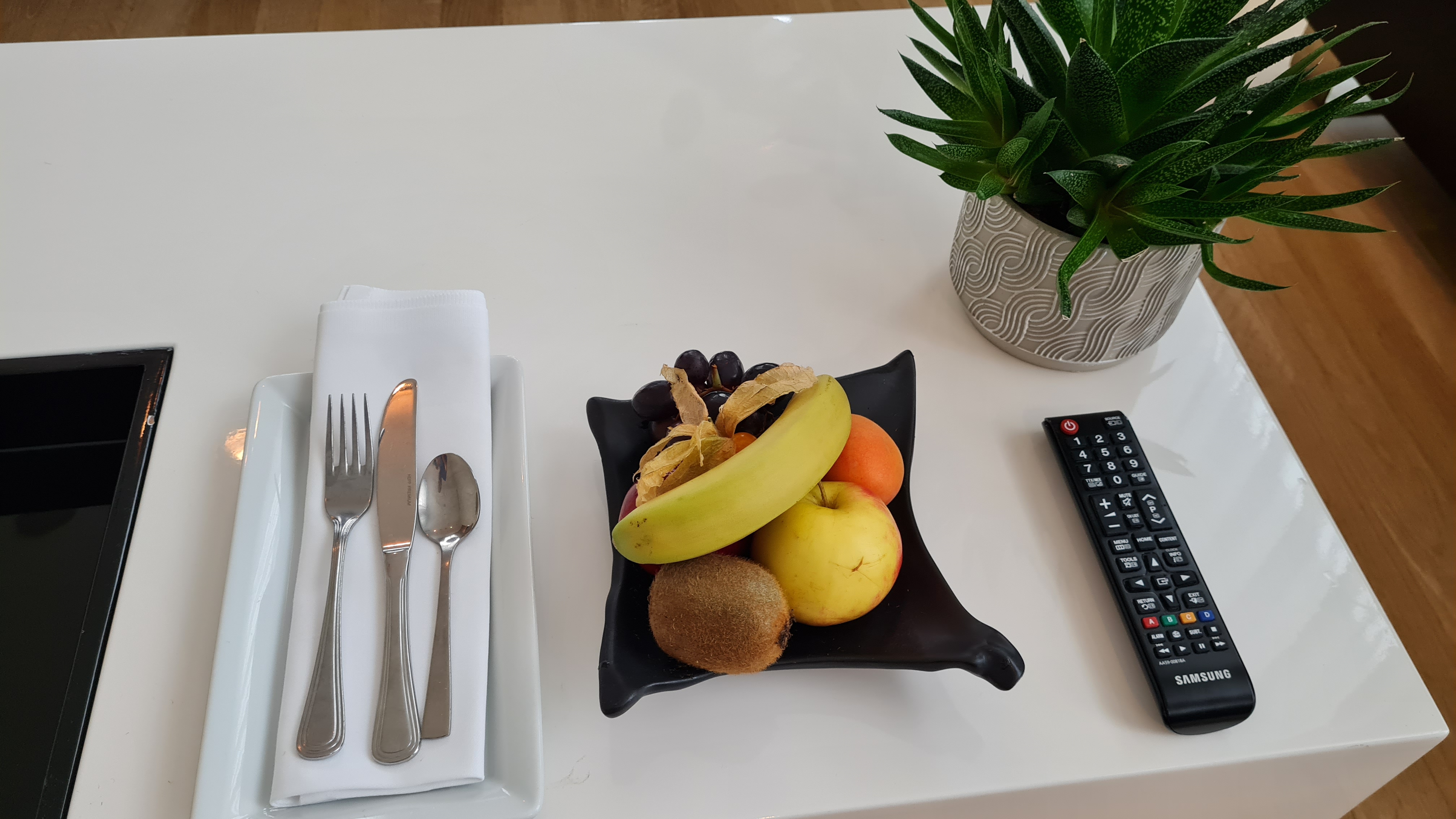 Välkomstgåva: Vatten x 2, fruktfat, kaka.