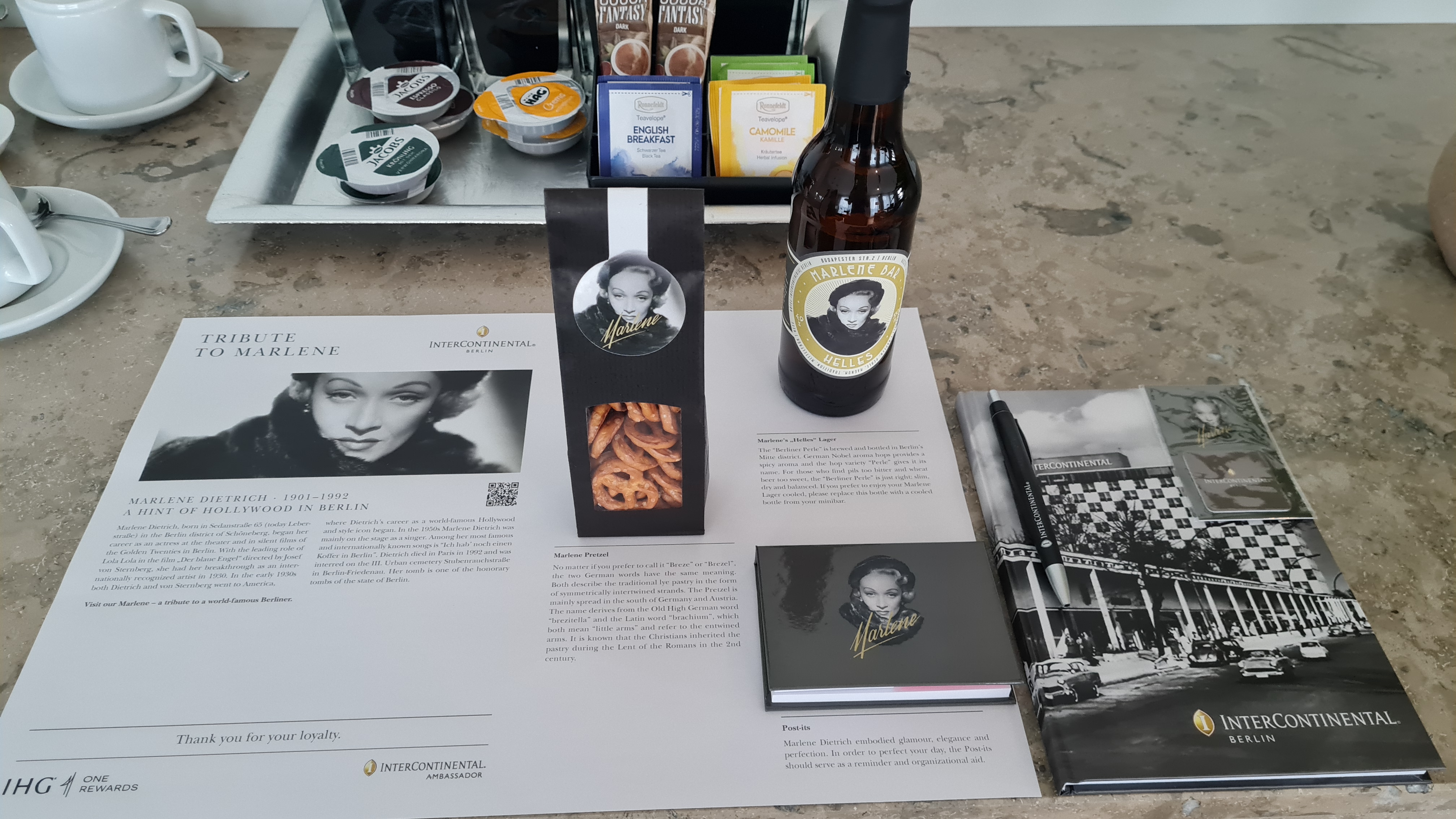 Välkomstgåva: Favorit i repris med fruktfat, salta kringlor, pilsner och skrivmaterial. Allt med en touch av Marlene... Ny design på anteckningsboken med retrobild av hotellet, trevligt!