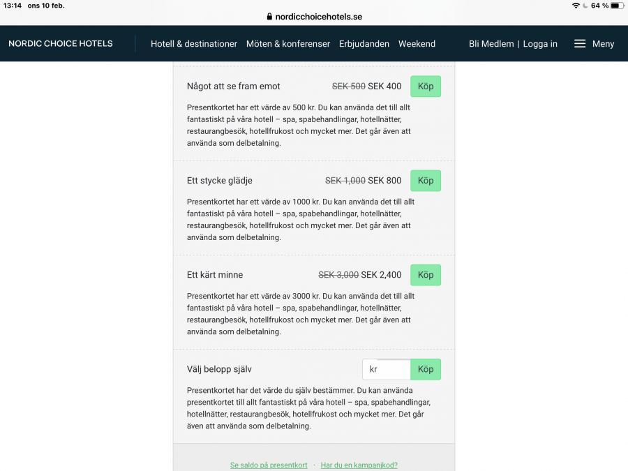 Jag upplever att det har varit en kunskapsbrist på hur dessa "nya" digitala presentkort ska hanteras ute på hotellen. Jag har några gånger blivit nekad att använda dom. Har då förklarar att det inte har varit något problem x antal gånger tidigare. Då har personen i fråga börjat bläddra i någon pärm eller konsulterat en kollega. Det har aldrig varit något problem att använda presentkortet efter lite efterforskningar från personalen.Konstigt för jag blev nekad den 21/12 vid betalning på plats.