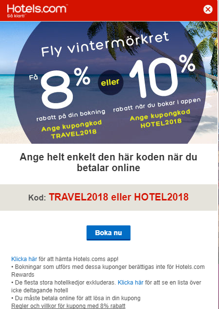 Har aldrig förstått vitsen med Hotels.com och deras rabatter. Tror dom att folk är helt bakom flötet? Ingen av dessa ”rabatter” ger ju rewardnätter. Så antingen förlorar du på att använda rabatten eller så går det jämnt upp jämfört med att inte använda någon rabatt alls och samla rewardnätter istället som ju är värt 10%. Vad är poängen liksom? Meningslöst. Förstår inte att de kan hålla på med sina kampanjer som egentligen ger absolut ingenting.Hotels.com har nu denna rabatt. Ange TRAVEL2018 på hemsidan för 8% rabatt eller HOTEL2018 i appen för 10% rabattVisa bifogad bild 71201