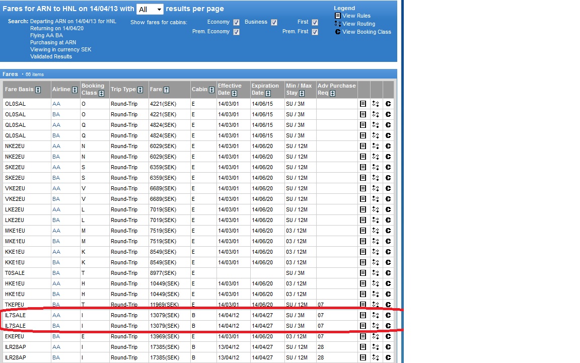 Prova även att kryssa ur "Validate Fares" och kryssa i "Show Fares for all travel dates" på sökskärmen och begränsa dig till AA eller BA så kan du se regler oavsett datum.