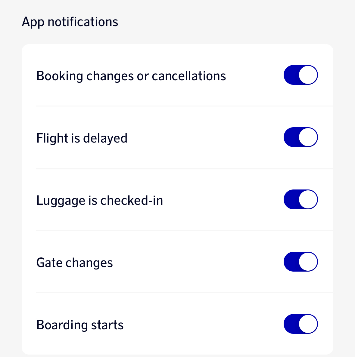 Bra poäng, man vill ju inte råka stänga av alla notiser bara för att man inte vill ha reklamen.Could we please stick to having notifications be for essential flight related things please? Special offers are not essential, or at the very least an option to turn it off. In the app I can only see options turn off emails, telemarketing etc.