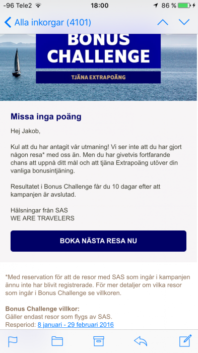 Vilken bedrövlig info. Står ingenting i mitt mail. Jag råkar dock veta att jag avslutade min sjätte T&R för några timmar sedan så i mål med god marginal.Jag fick ett mail idag om hur det går med challengen. Jag har gjort åtm fyra resor som registrerats på mitt EB-konto, men e-posten säger noll