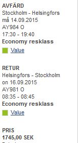 Förlåt, 1745 SEK betalade jag för Finnair (inte 1700 som jag skrev), och det går fortfarande att boka: