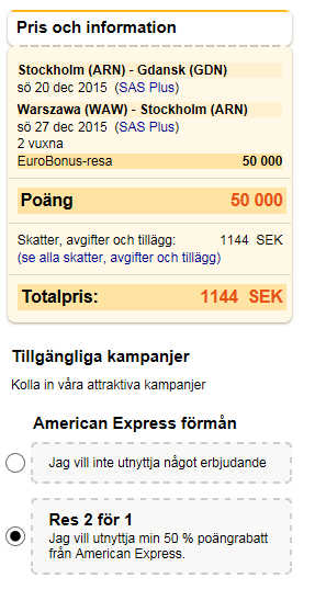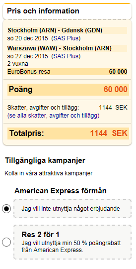Amex 2-4-1 rabatt fungerar bra för mig. Jag vet dock inte vilka flygningar du har valt.Kan någon göra mig lite klokare på detta? Som ni ser försöker jag boka ARN-CPH-GDN- open jaw -WAW-CPH-ARN. När jag applicerar 2-4-1 på detta går priset från 60' till 50' poäng (och inte 30'). Har jag missat något eller är det sas it som spökar?