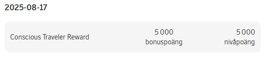Jag fick svar från EBD-supporten. Tydligen ett tekniskt fel som de identifierat och ska rätta till i slutet av månaden.Jag fick 5000 bonuspoäng för en vecka sedan för årets 10 steg i conscious traveler. Ska det inte vara nivåpoäng?