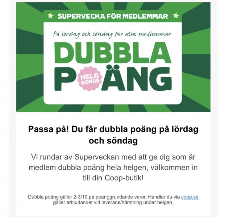 Det här är min erfarenhet också.Vid förra kampanjen behövde man betala minst en månad. Relativt snart efter första betalning var gjord krediterades poäng till Coop.