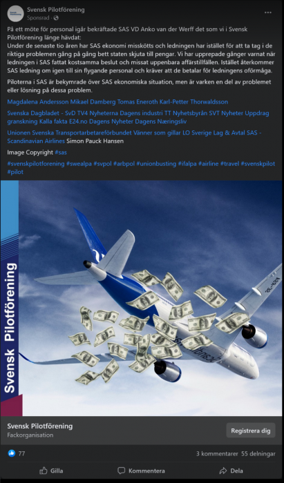 Den här typen av marknadsföring känns nästan lite skrämmande faktiskt. Ledningen av SAS har nog garanterat bättre koll på ekonomin av SAS än Svensk pilotförening eller flygbolagets piloter. Det blir ren propaganda.Tonen skruvas upp. Nu annonserar svensk pilotförening på min facebook och låter hälsa att de gärna berättar för ledningen i SAS hur bolaget ska skötas: