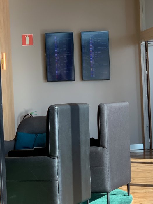 Ända sedan loungen öppnade har jag stört mig på att sladdarna till flight-monitorerna hängt ner och synts under skärmarna.Häromdagen fixade jag till det. Tog ingen förebild tyvärr...It's all in the details...