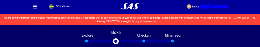 Även SAS appen ligger nere för underhåll till 07:00 imorgon - Står att de är pga av EB, märkte även tidigare på nya sidan att de krävdes 100 segment för att bli EBD i appen står de dock fortfarande 90?Verkar vara dags för lite underhåll.