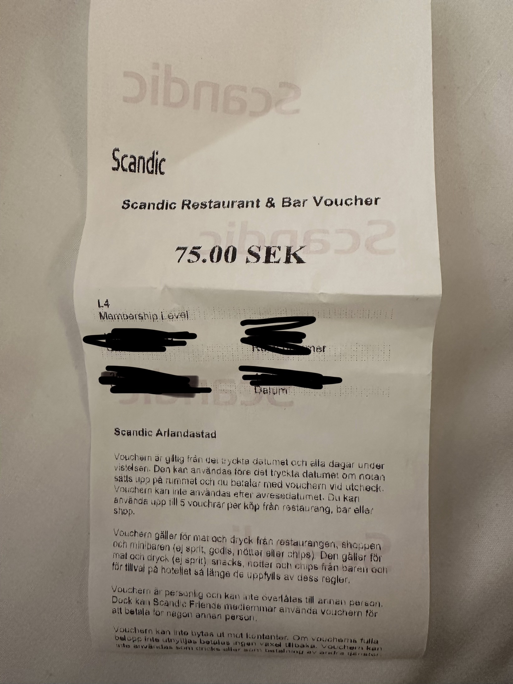Testade Scandic för första gången efter matchningen. Ingen bra upplevelse så här långt på Arlandastad. Först fick jag ingen fråga om kupong alls innan jag sa till. När receptionisten till slut förstår vad jag pratar om så ber jag om att få den i poäng då jag inte kommer hinna nyttja kupongen. Då knappade receptionisten i flera minuter på sin dator och skrev till slut ut en kupong på 75kr. Kommer jag få det här i Scandic poäng frågar jag? Svaret jag får är ja. Eller är jag helt tappad och det är den som ger mig poängen?
