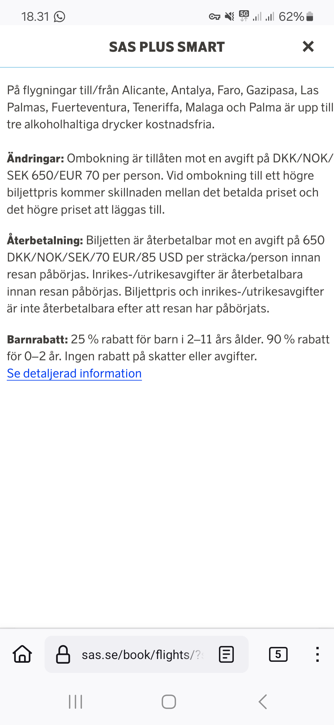En biljett bokad i SAS Plus Smart inom Skandinavien och/eller Europa är endast avbokningsbar mot en avgift på 650 SEK/NOK/DKK när du avbokar biljetten i sin helhet. När du avbokar ena vägen är endast skatterna återbetalningsbara på den delen som tas bort, vilket i det här fallet var beloppet 495 SEK. "