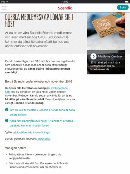 Man kan enligt reglerna inte kombinera förmåner utan man väljer vilket kort som skall gälla. I praktiken är det dock annorlunda, våra system spottar ju tex ut kupongen för scandic friends automatiskt och i princip alla delar ut den även om gästen bett om EB poäng istället för scandic,