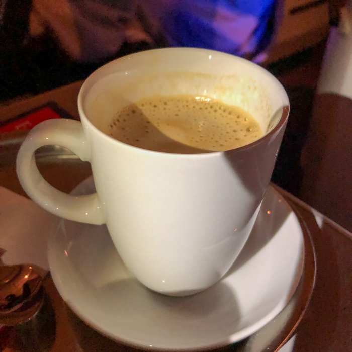 Maten serverades sedan från vagn. Där kunde man välja förrätt, fick bli carpaccio som var ganska ok. Varmrätten var dock en besvikelse, smakerna satt men fläsket var torrt och segt. De revanscherade sig med en bra strudel och god ost. Drsck någon kaffedrink, inte alla lika snygg som den som @Brandten drack. Var mer kaffekask över min