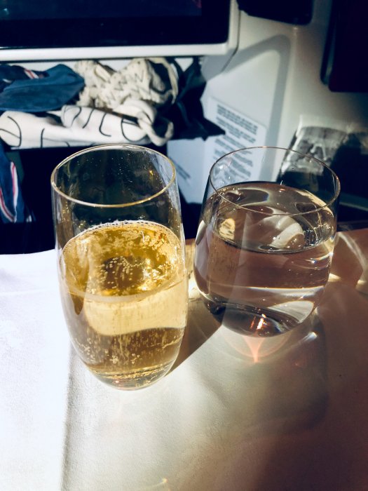 Maten var alltså helt ok men hade mycket högre förväntningar. Vinerna var snäppet bättre än många andra kör i business. Servicen var dock en blandning av stressad och effektiv. Vissa saker var bra (de klarade middag och frukost på 1h så effektivt för de som vill sova) men dåliga på att kolla om man vill ha mer att dricka och de plockade inte bort (halvfulla vinglas stod överallt i timmar efter att folk somnat).