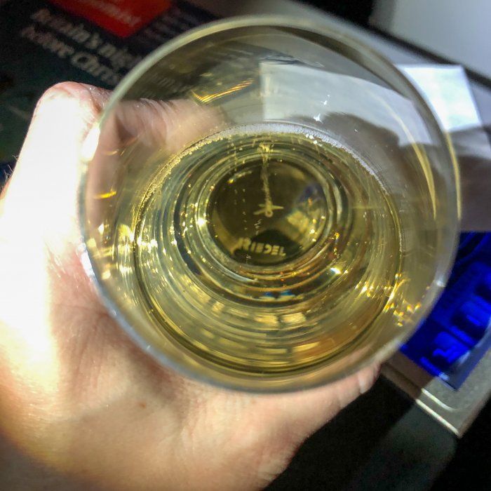 Så till slut fick jag mitt efterlängtade glas champagne. De serverar Duval-Leroy som champagne, bättre än jag mindes den men den långa väntan kanske bidrog. I övrigt erbjöds ett österrikiskt mousserande (samma producent som de körde på ARN-VIE) och en prosecco.